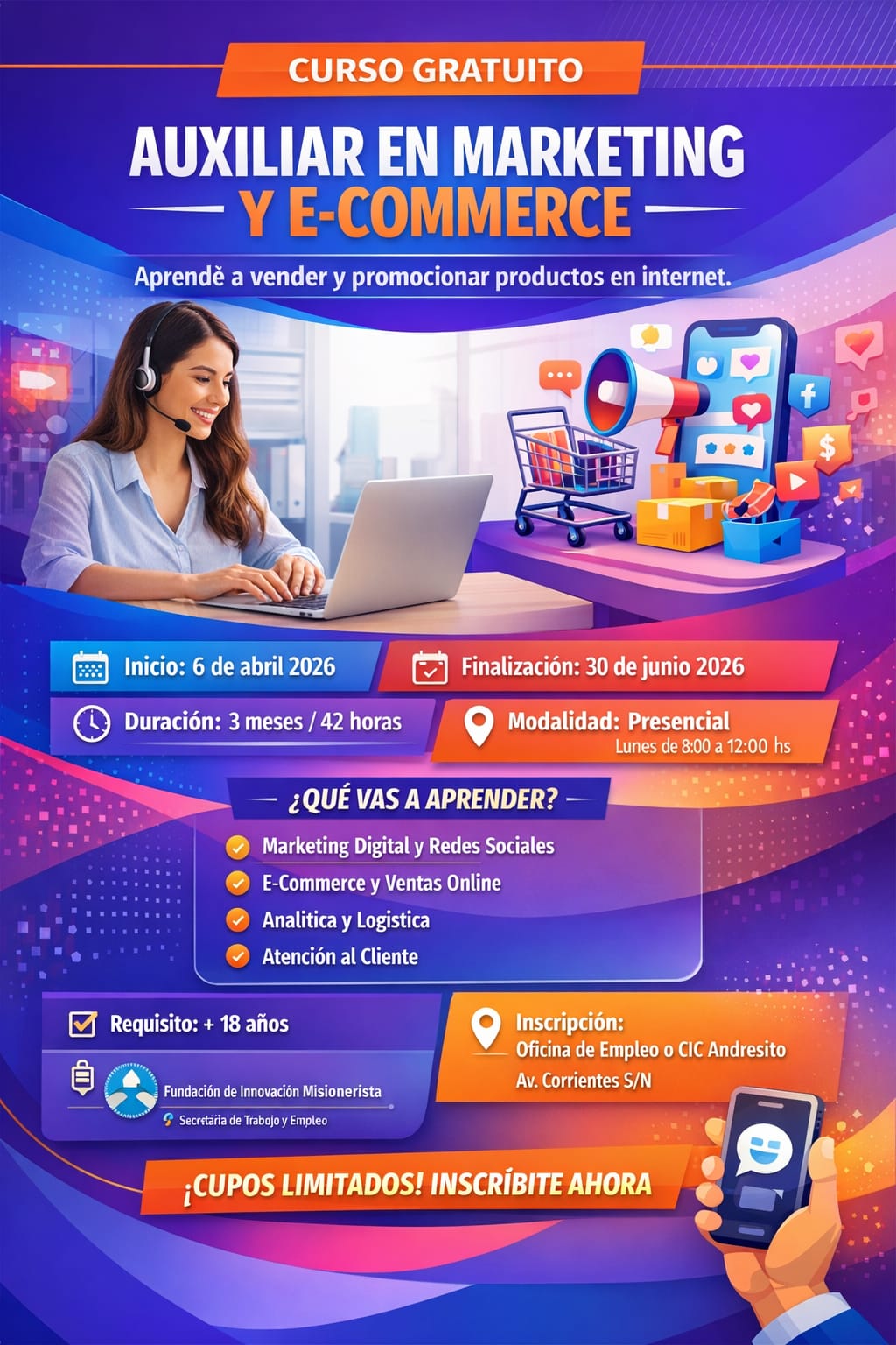 La Fundación de Innovación Misionerista junto a la Secretaría de Trabajo y Empleo lanzan un curso gratuito de Auxiliar en Marketing y E-Commerce, destinado a mayores de 18 años. La capacitación comenzará el 6 de abril de 2026 y finalizará el 30 de junio de 2026, con una duración total de 3 meses (42 horas) en modalidad presencial, los días lunes de 8:00 a 12:00 hs.