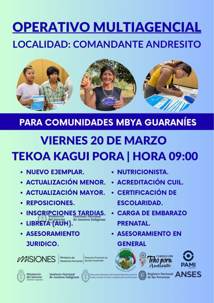 Este viernes 20 de marzo se llevará adelante un operativo multiagencial en la localidad de Comandante Andresito, destinado a comunidades Mbya Guaraníes. La actividad se realizará en Tekoa Kaguí Porá a partir de las 09:00 horas.